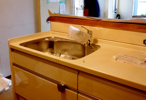 システムキッチン据付完了。落ち着いた色合いのキッチンで、床チークに馴染んでいます。上部に70mmのチークカウンター↑。