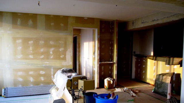 クロス工事が進んでいます。西日が真横から当る部屋です。西日によって小さな下地の不陸が現れます。念入りに下地調整が行われています。