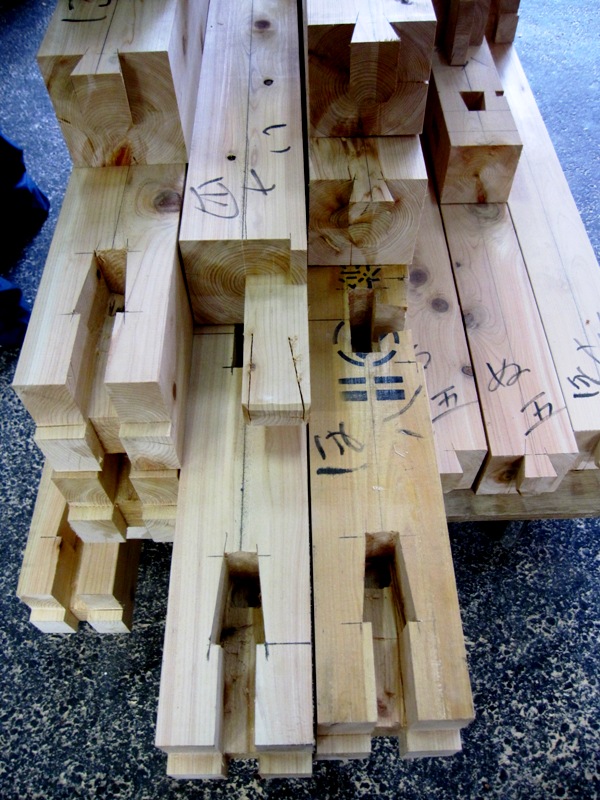 下高井戸の家。土台の刻みが完了。引き続き、柿渋塗装へ。明日は、敷地に仮設WCを入れます。