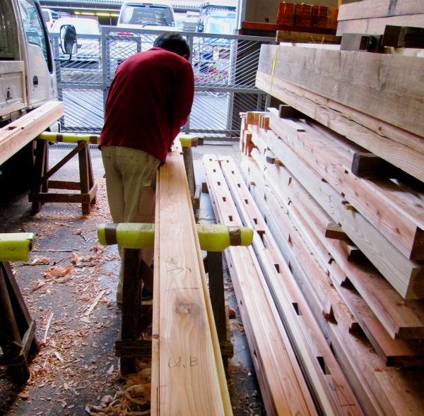 下高井戸の家。下小屋では親方が通し柱の刻み。通し柱は杉の5寸です。