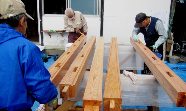 明日は2工程目の「柿心(ししん)」という「柿渋+植物油」をエマルジョン化した塗料を塗ります。