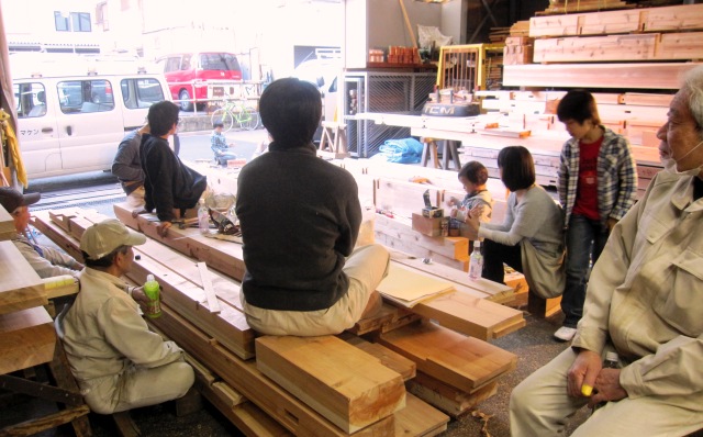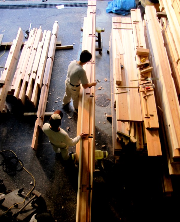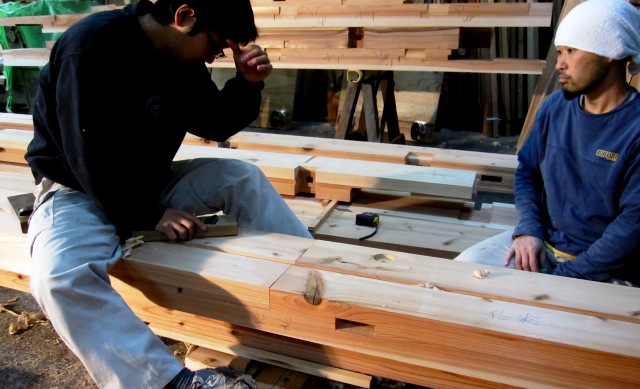 建前の前に下小屋で一度組んで、うまく入れる為の調整、全体長さの確認などを行います。