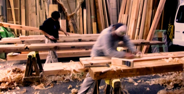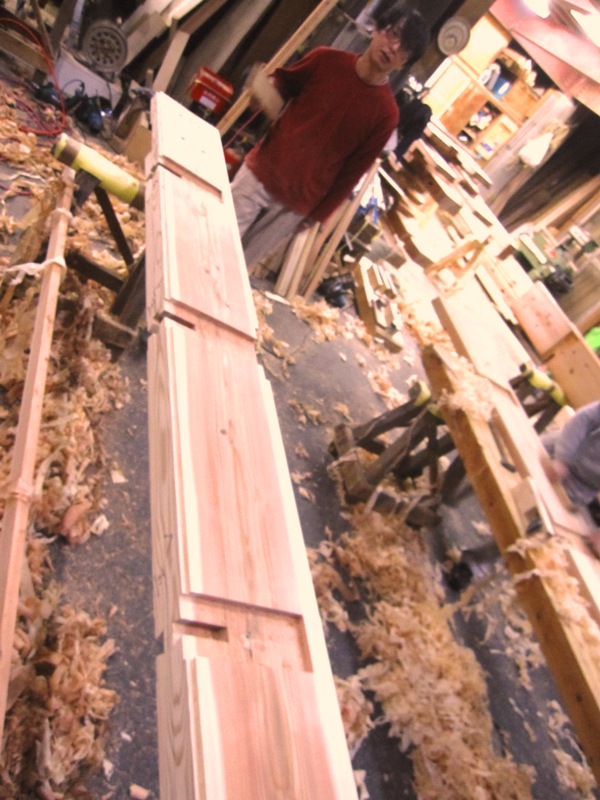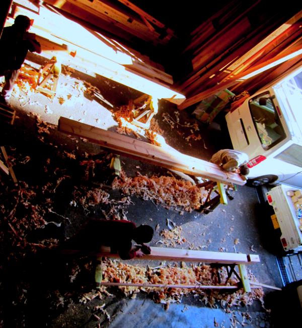(↓下写真)親方KBが1階のメインの梁を仕上ています。