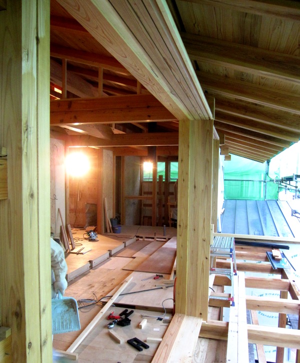 内部では2階の木製建具枠の取付や大壁(羽目板)の下地工事など。
