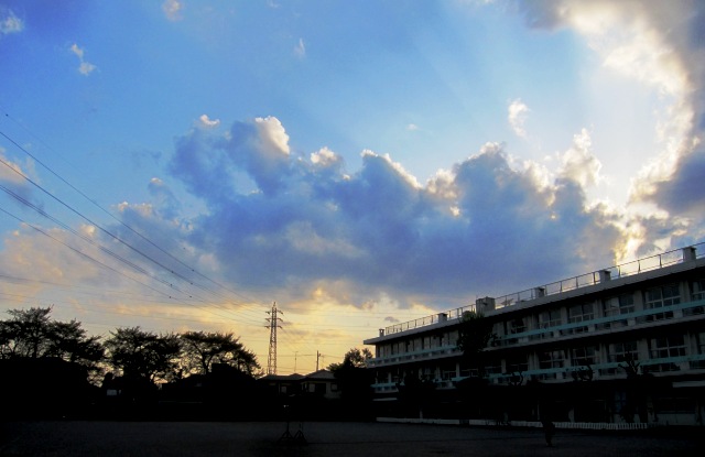 夕方、市議の選挙投票で小学校へ。 夕焼けがキレイ。