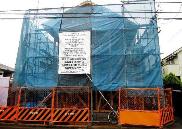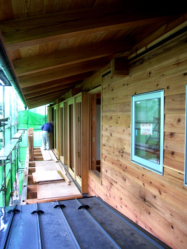 午前中、雨の降る前に屋根のアスファルトルーフィング敷まで完了。