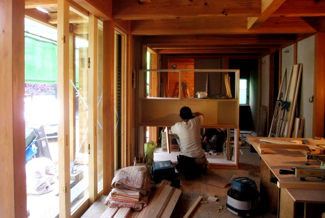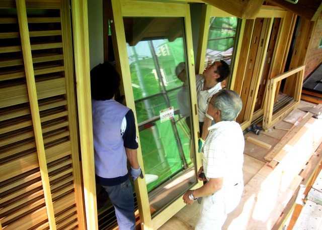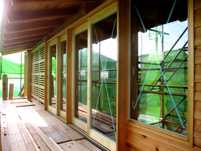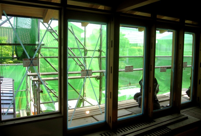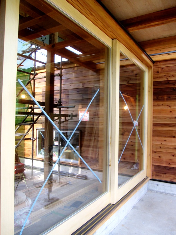 外部木製建具の硝子が入りました。全てペアガラス。硝子自体で最も重たいものは100kgを越します。無事、外部の硝子が全て入りました。硝子工事はサカウチさんです。