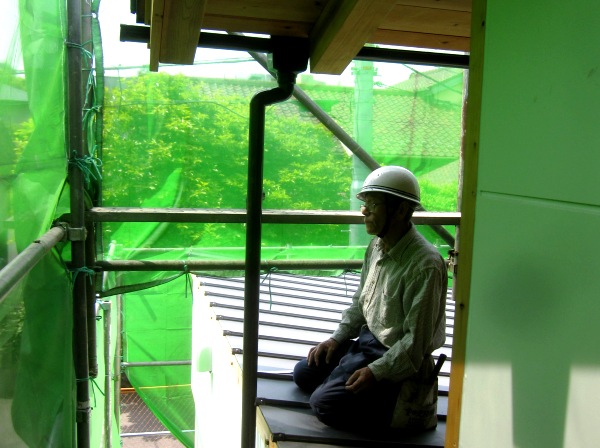 内部では造作家具工事が進んでいます。足場解体を前に樋工事を田中板金さん。