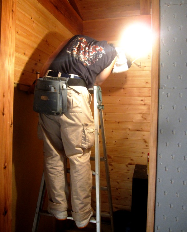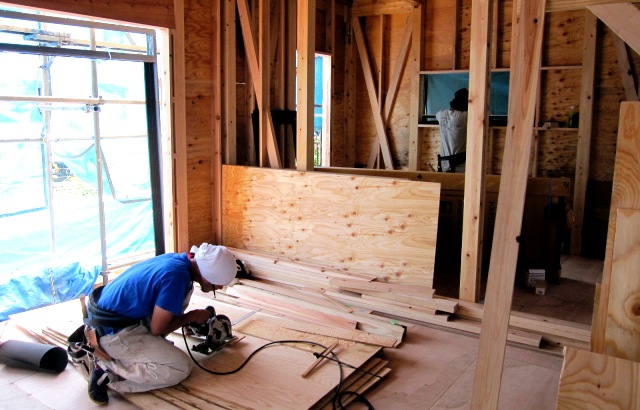 大工修行1ヶ月目のHG。玄関納戸壁の松羽目板張に試行錯誤。そして奮闘中。特に換気口の廻りで相当、苦戦したようです。