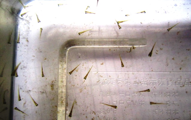 夏祭りの金魚すくいで獲った金魚が産卵し、100匹ほど孵化しました。