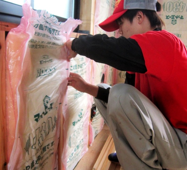 台風2号の影響で風が強かった一日。現場ではグラスウール充填工事など。