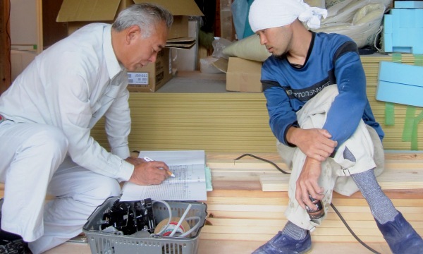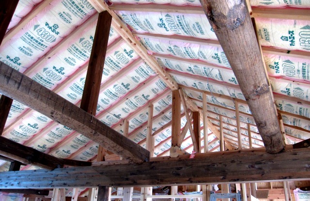 下写真:グラスウール張りする新人MT。 ステープルのピッチ@はしっかり200mm。 気流止などもしっかり行われています。工程を打合せするIS部長と親方KJ。工程通り、順調です!。