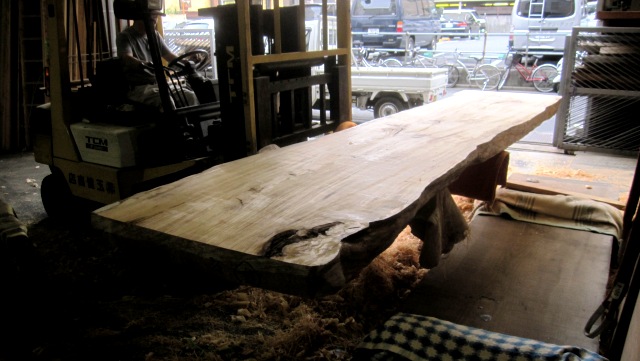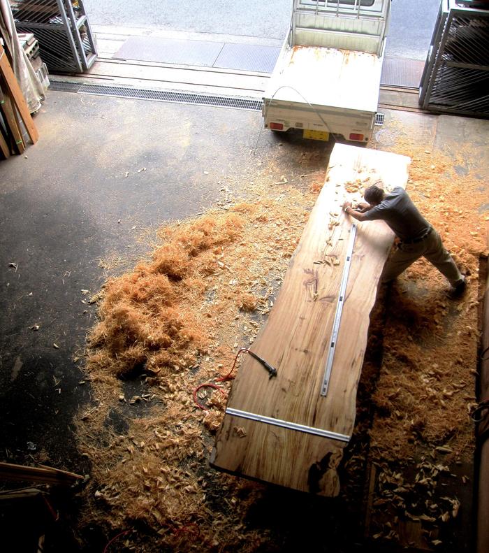 下小屋では、松の一枚板でダイニングテーブルを製作中。