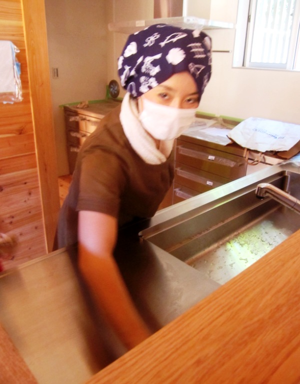 椛澤さんから頂いた「青森名産品を柄にした手拭い」を頭に巻いてキッチンを掃除する妻。