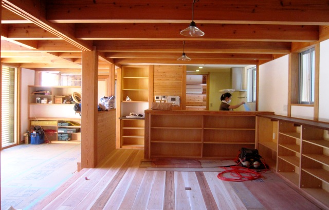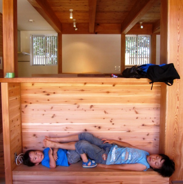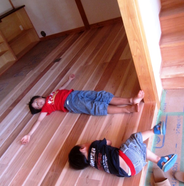 子供たちは、養生を剥いだ無垢板の上で気持ち良さそうに寝転び放題。