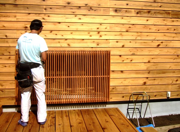 親方:小林が和室の杉:窓格子取付。